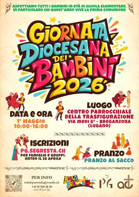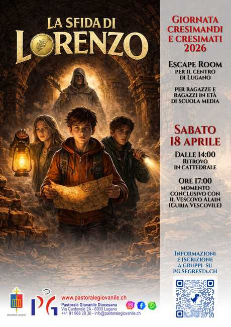 - Sabato 18 aprile, dalle ore 14:00 a Lugano, invitiamo tutti a partecipare alla Giornata Cresimandi e Cresimati 2026: un pomeriggio ricco di attività, incontro e gioia, con il coinvolgente gioco dell’Escape Room nel centro città. Un’occasione speciale per vivere la fede in modo dinamico e comunitario. I dettagli sono disponibili sul volantino.