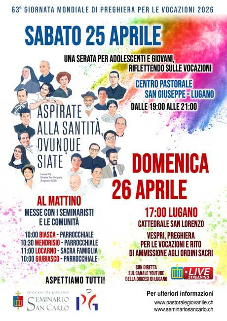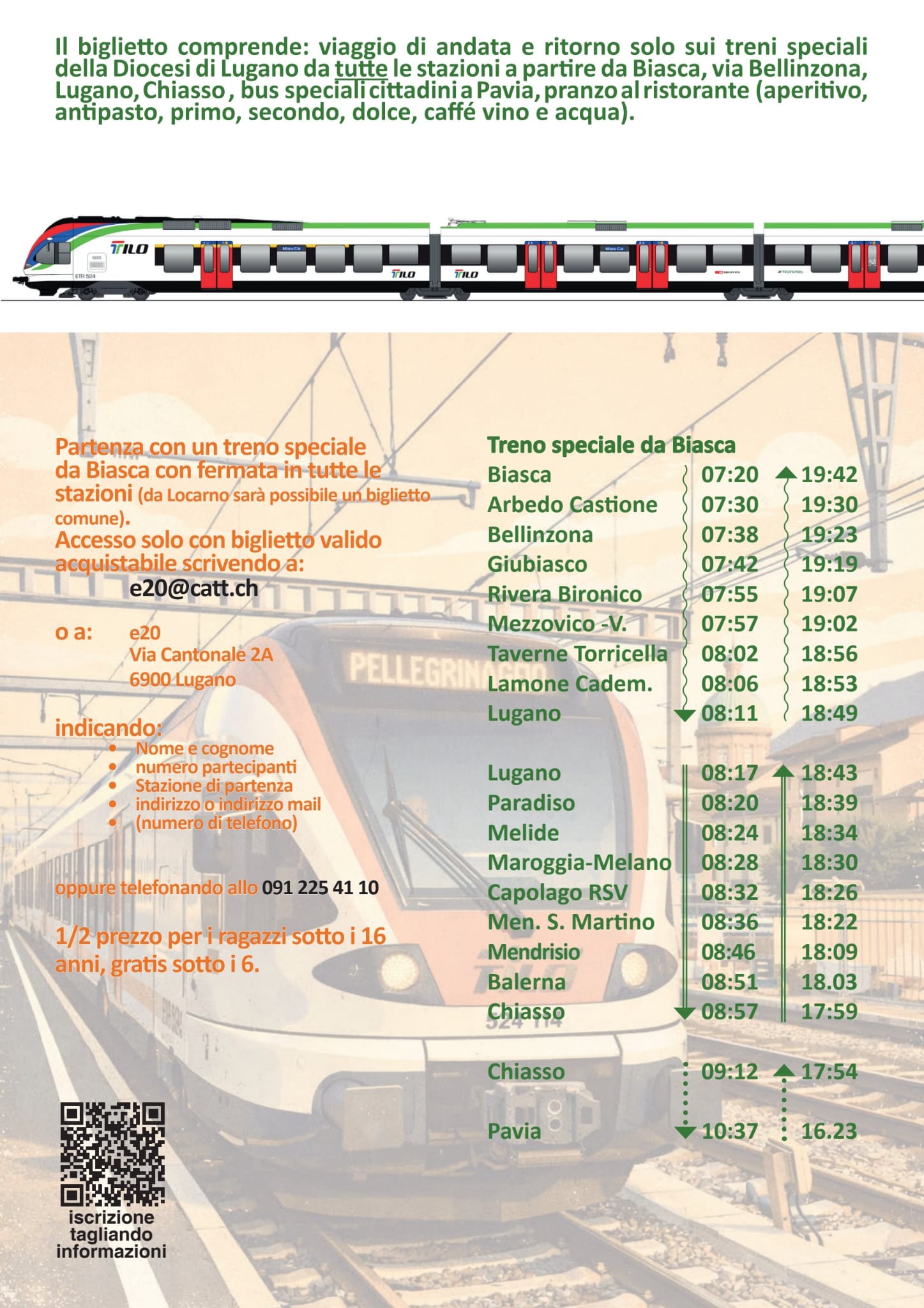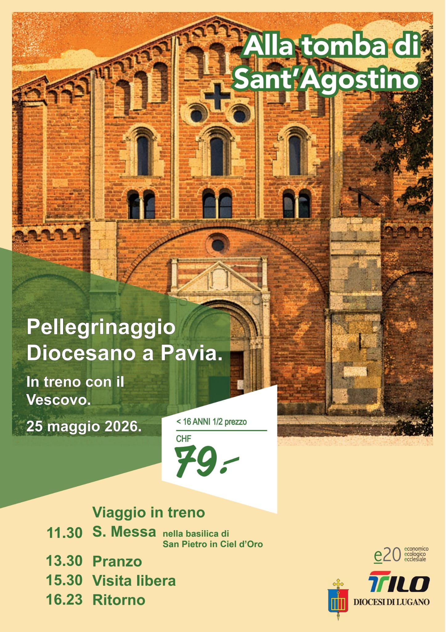 - Diocesi di Lugano invita al tradizionale pellegrinaggio del lunedì di Pentecoste, il 25 maggio, memoria di Maria, Madre della Chiesa. La meta sarà Pavia, con visita alla Basilica di San Pietro in Ciel d’Oro, dove si trovano le reliquie di sant’Agostino. Il programma prevede il viaggio in treno speciale TiLo, la Santa Messa presieduta dal Vescovo Alain, il pranzo e tempo libero per visitare la città. Quota di partecipazione: 79 CHF (ridotto per i ragazzi dai 6 ai 16 anni). I posti sono limitati. Iscrizioni al numero 091 225 41 10 oppure via email: . Vi aspettiamo numerosi!